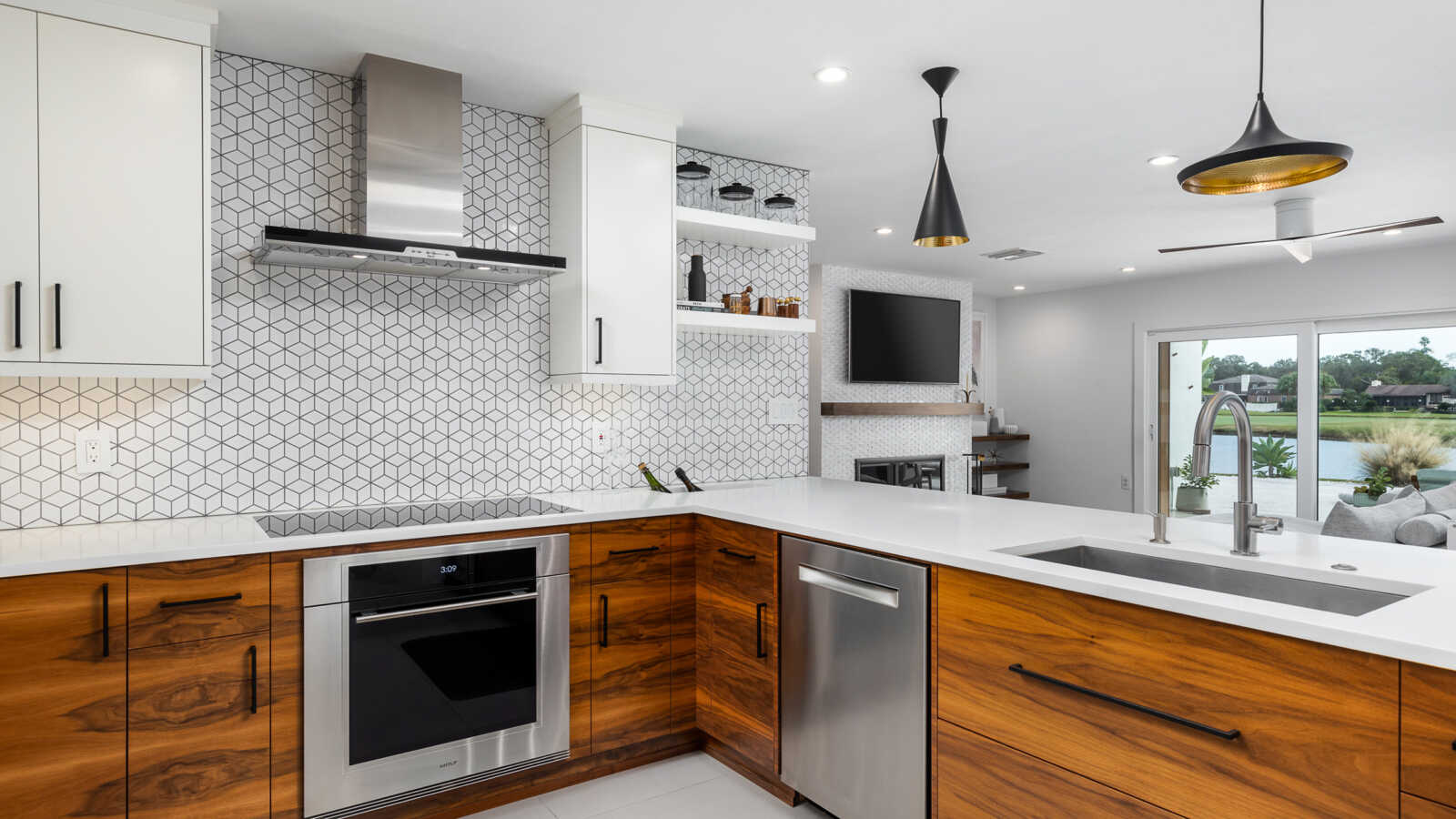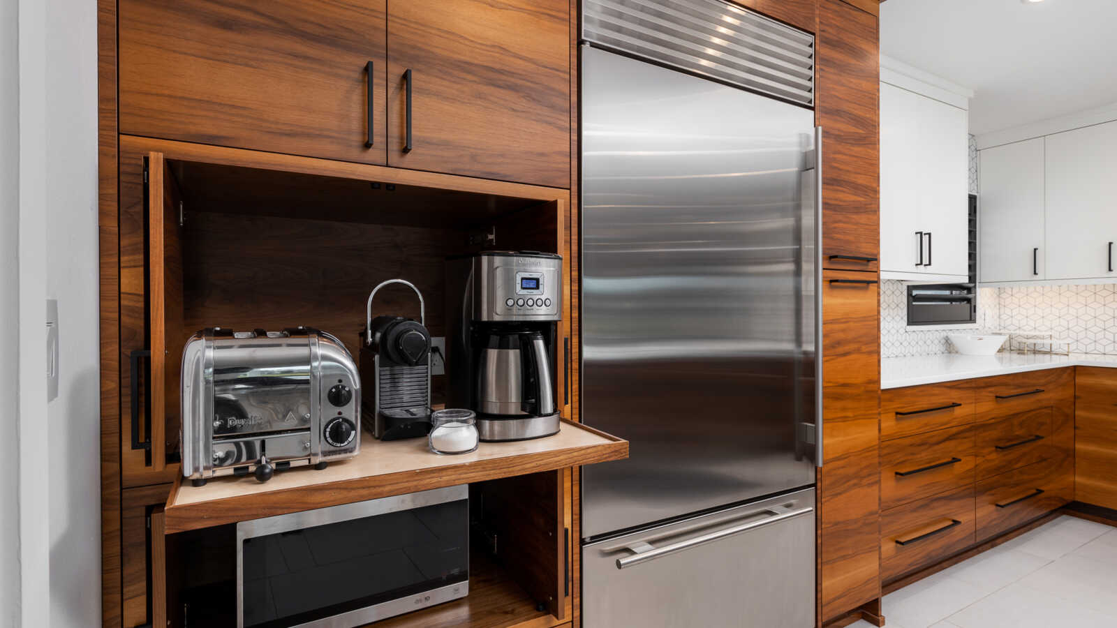 The heart of this home is an expertly designed chef’s kitchen that boasts walnut cabinetry, geometric tilework, and a waterfall island. Smart storage, integrated appliances, and designer lighting ensure each element feels intentional and refined.